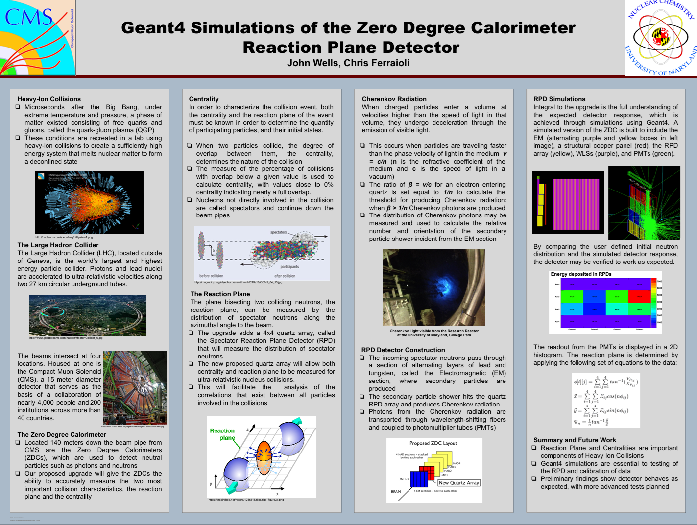 At the Mignerey Group at the University of Maryland, my work focused on using simulation as a first-class scientific tool. Rather than treating software as a black box, I designed and engineered detector models from geometry up—materials, volumes, physics lists, and readout logic—then validated them against analytical expectations and experimental constraints.